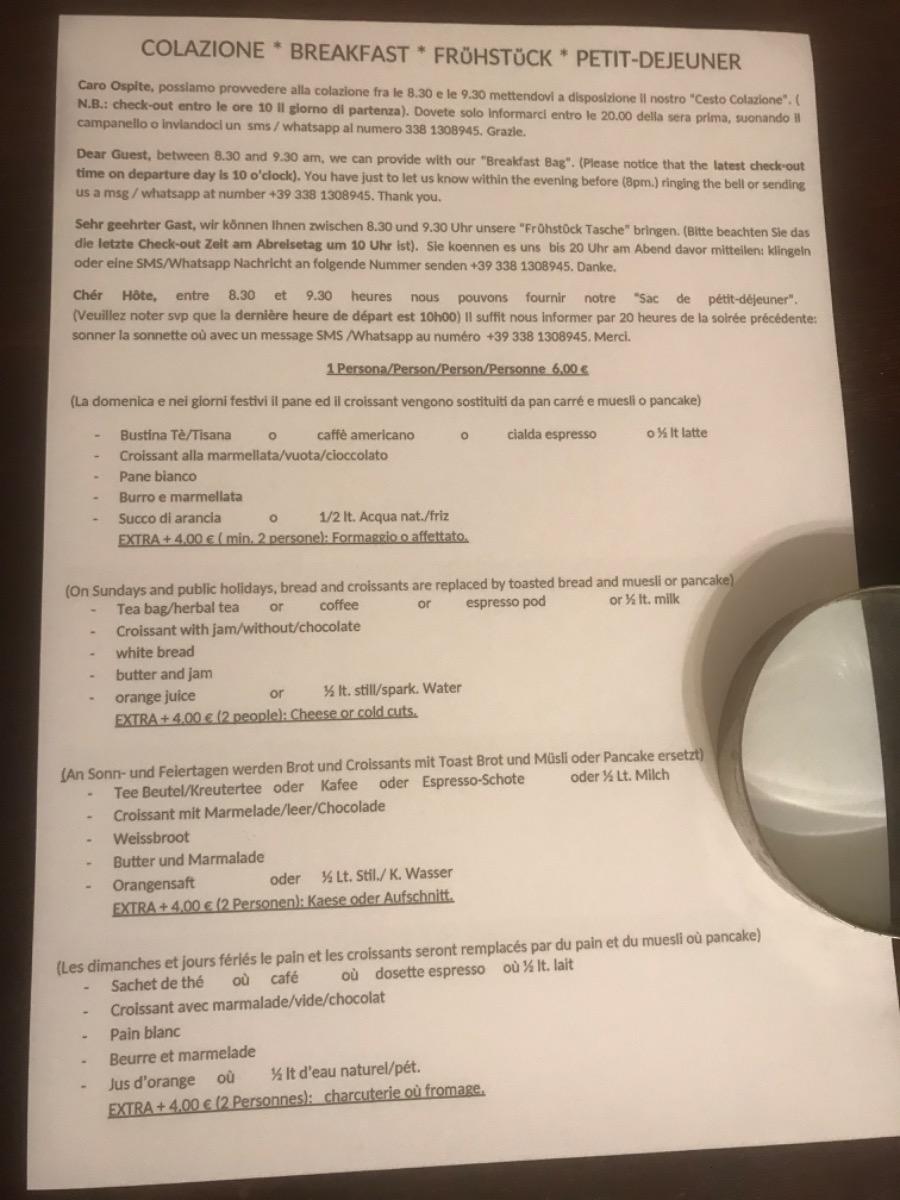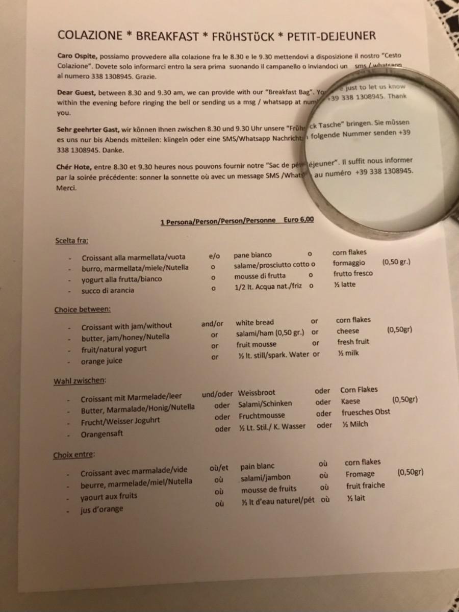 You can request, by the evening before (8. 00 pm), our "Breakfast basket", at the price of 5. 00/7. 50 € p. p., which we will take to your room (where you will find the Menu) between 9.00 and 9. 30 am.